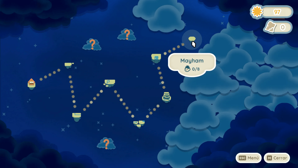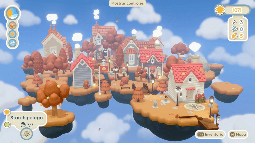 Hablando de historia, la verdad es que Twinkleby no es un juego que esté centrado en una trama en concreto, y eso está bien. El argumento está ahí para acompañar al jugador. Básicamente gestionas estas islas flotantes para construir dioramas, atraer vecinos (o expulsarlos), descubrir secretos antiguos y decorar hasta que tu isla parezca sacada de un sueño de algodón de azúcar y ser el más divo del lugar. Creemos que esa ligereza narrativa es parte de su encanto: no tratas de salvar el mundo ni descubrir conspiraciones intergalácticas; tratas de crear algo bonito y personal donde puedas hacer cualquier cosa, estilo los Sims. Esa sensación se acentúa porque la historia se va desarrollando a través de los escenarios, de los objetos que encuentras, de la estela de estrellas que recoges… Eso hace que todo fluya muy natural.