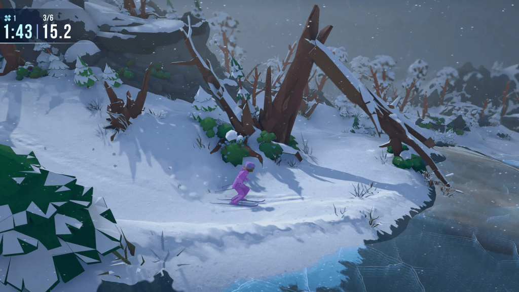 El sistema de progresión no se basa tanto en desbloquear habilidades como en mejorar como jugador. No sentimos que el juego nos lleve de la mano, y eso nos ha gustado. Aprendes a leer el terreno, a anticipar curvas y a entender cómo responde el personaje sobre la nieve. Es una curva de aprendizaje orgánica, casi invisible, pero muy efectiva. Y cuando te das cuenta de que estás bajando una montaña que antes te parecía imposible sin despeinarte demasiado, la sensación es impagable.