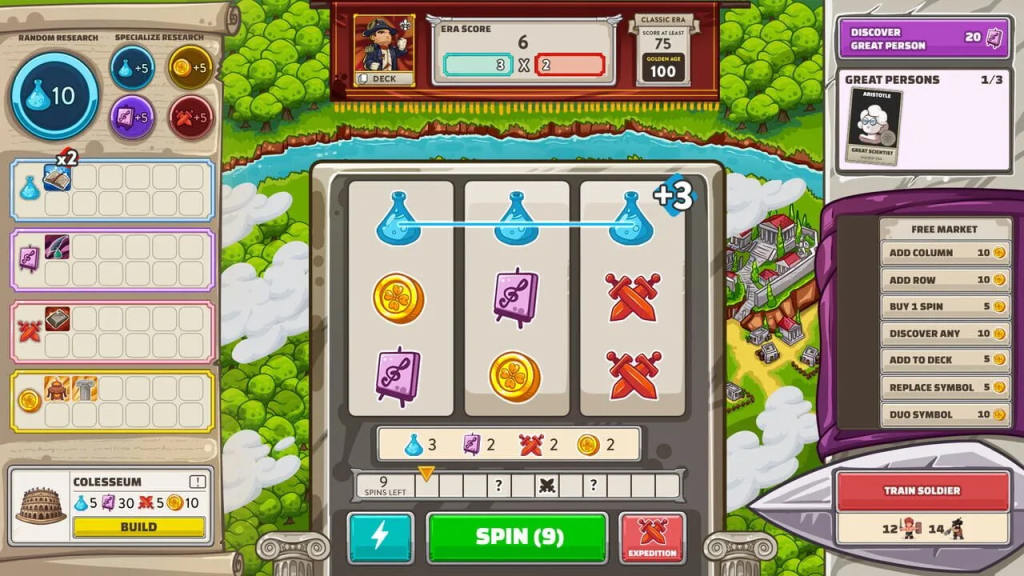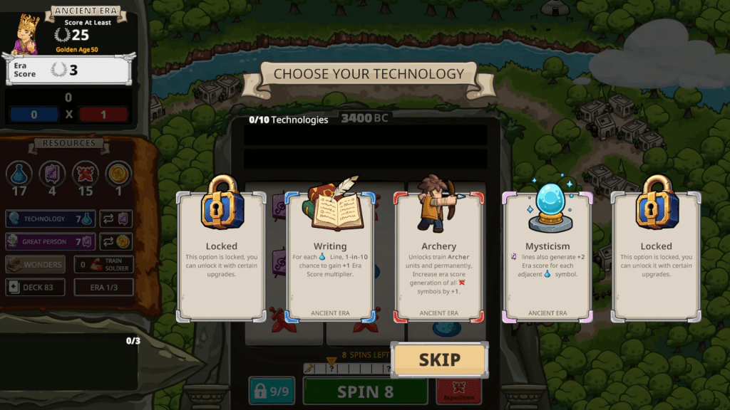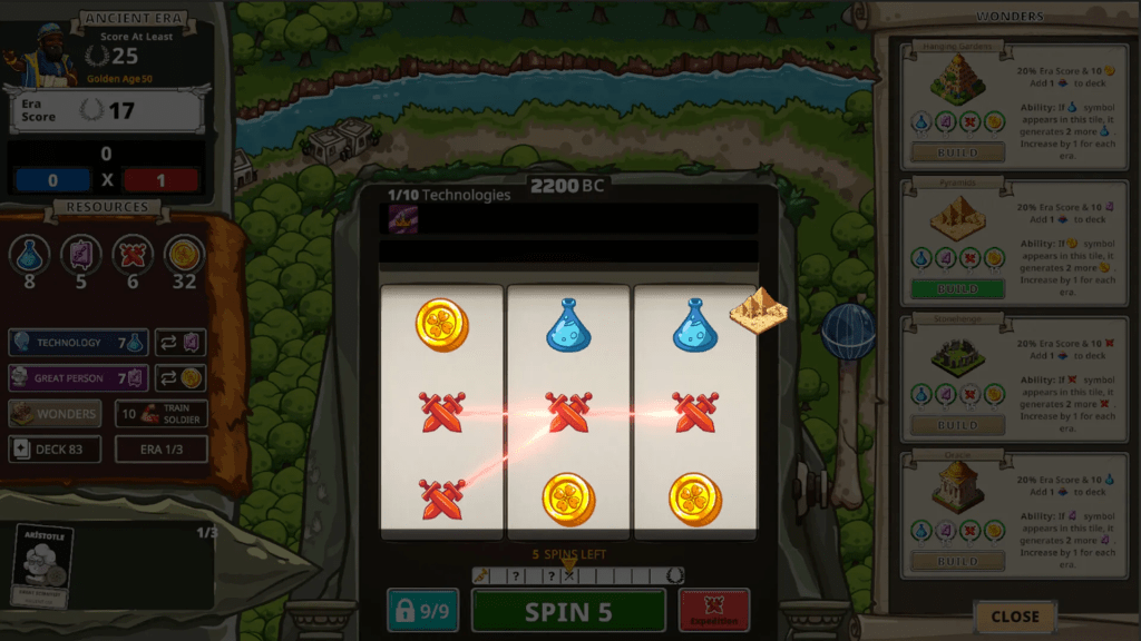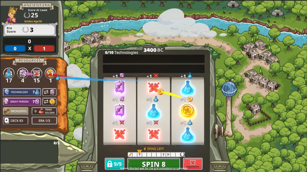 Donde realmente empieza a mostrar su personalidad es en la jugabilidad. Spinera gira alrededor de un sistema de recursos generado mediante un mecanismo inspirado en una máquina de slot. Cada giro produce símbolos que representan diferentes recursos necesarios para hacer avanzar nuestra civilización. A partir de ahí empieza el verdadero juego: decidir cómo utilizar esos recursos para investigar tecnologías, construir maravillas, fortalecer nuestras defensas o mejorar el mazo de símbolos que aparecerán en futuros giros. Es un sistema curioso porque mezcla planificación estratégica con un elemento de azar constante.
