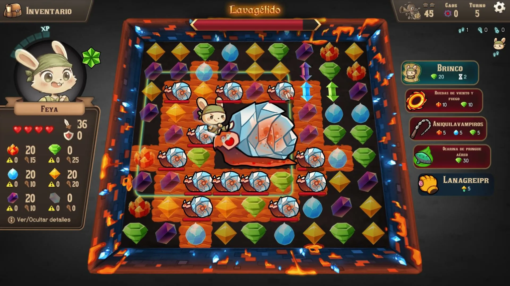 Además de los combates, los puzzles ambientales aportan otra capa de estrategia que nos ha gustado mucho. Hay que prestar atención a los distintos planos elementales: lava del Cryovolcanic, vapor del Elemental Plane of Steam o barro pegajoso que bloquea movimientos. Esto nos obliga a planear rutas, priorizar enemigos y usar nuestros ataques de manera inteligente. Creemos que la combinación de combate y puzzle hace que cada sala se sienta única y divertida, evitando la repetición que a veces sufren los juegos de match-3.